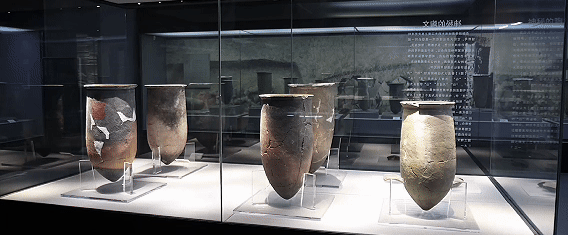 “這是一件出土于安徽蒙城新石器時(shí)代尉遲寺遺址的大口陶尊,距今大約4800年?!敝v解員指著一件陶器展品,“它的特別之處是器物上有著刻畫符號,分別是‘日’‘月’‘山’形。抽象的表達(dá)和組合,已經(jīng)超越了簡單的圖畫,使我們看到了漢字的雛形。”