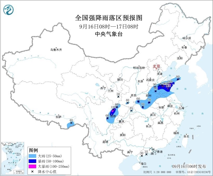 預(yù)計,9月16日8時至17日8時,四川盆地中西部、甘肅南部、河南中東部、山東中南部以及蘇皖北部等地部分地區(qū)有大到暴雨,其中,山東中南部、四川盆地北部等地部分地區(qū)有大暴雨(100~180毫米)。上述部分地區(qū)伴有短時強(qiáng)降水(最大小時降雨量20~50毫米,局地可超過70毫米),局地有雷暴大風(fēng)等強(qiáng)對流天氣。