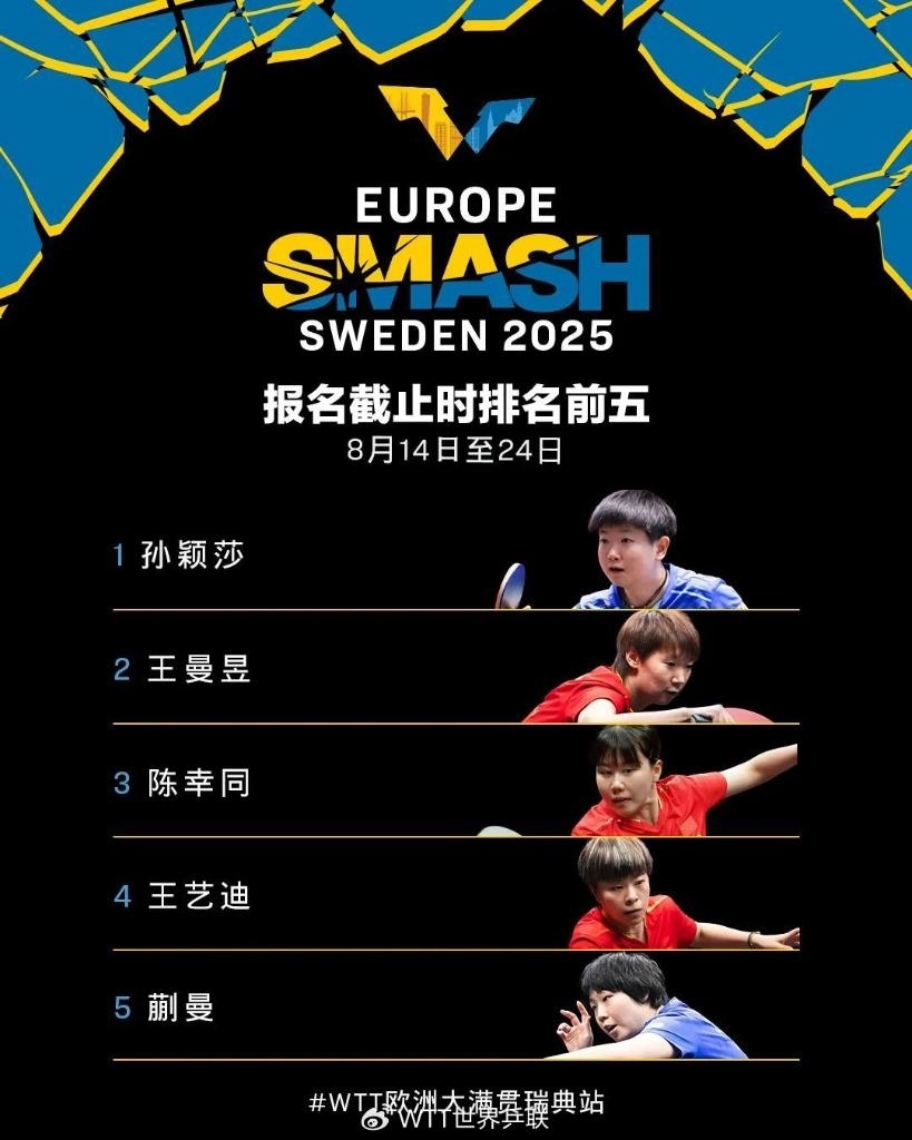 女單方面,報名截止時排名前五的運動員均為中國隊選手,她們是孫穎莎、王曼昱、陳幸同、王藝迪和蒯曼。國乒隊員石洵瑤、錢天一、陳熠也將出戰(zhàn)。其他協(xié)會名將包括日本的張本美和、伊藤美誠、大藤沙月和早田希娜,以及韓國的申裕斌。