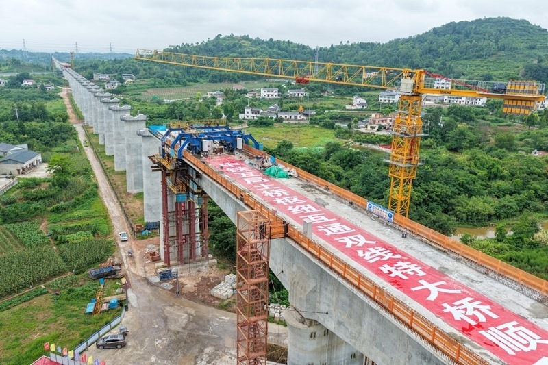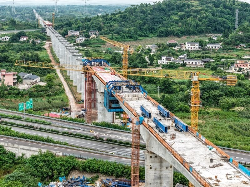 當(dāng)日,由中鐵五局承建的成渝中線高鐵土橋樞紐互通雙線特大橋連續(xù)梁順利合龍,該連續(xù)梁全長約242米,是成渝中線高鐵重慶段跨度最大的連續(xù)梁。土橋樞紐互通雙線特大橋位于重慶市銅梁區(qū),全長3271.6米,上跨重慶三環(huán)高速及銅安高速公路,共設(shè)有92個(gè)橋墩,2個(gè)橋臺(tái)。