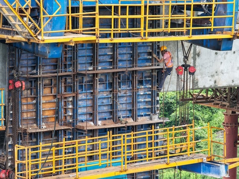 7月8日,工人在成渝中線高鐵土橋樞紐互通雙線特大橋建設(shè)現(xiàn)場施工作業(yè)(無人機(jī)照片)。