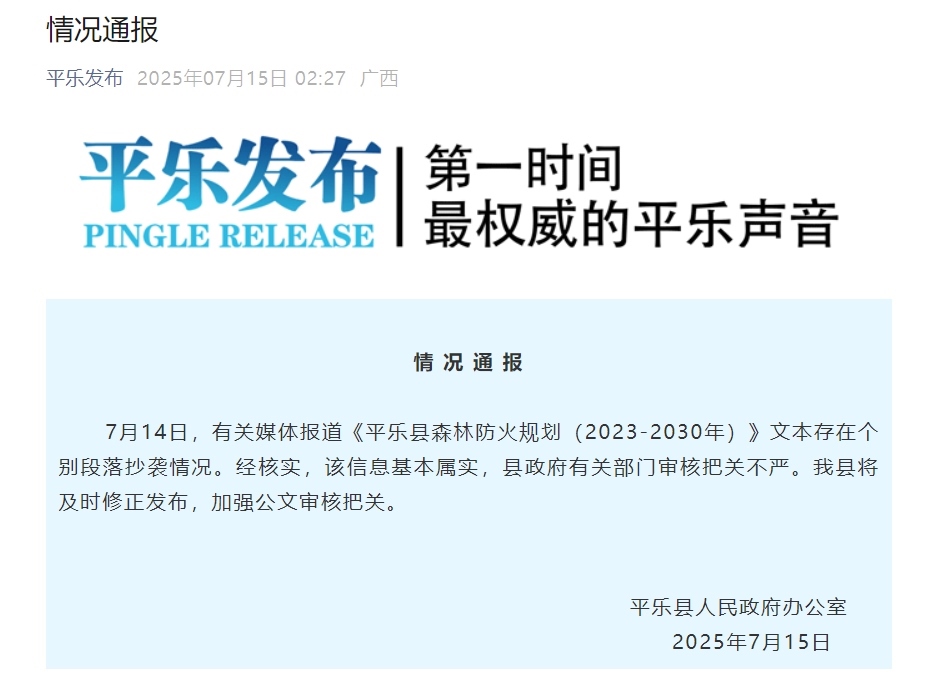 7月14日,有關(guān)媒體報道《平樂縣森林防火規(guī)劃(2023-2030年)》文本存在個別段落抄襲情況。經(jīng)核實,該信息基本屬實,縣政府有關(guān)部門審核把關(guān)不嚴(yán)。我縣將及時修正發(fā)布,加強公文審核把關(guān)。