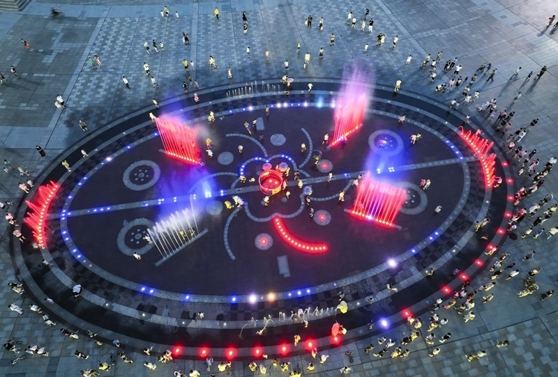 7月24日,市民和游客在河南省濟源市世紀(jì)廣場賞噴泉納清涼(無人機照片)。