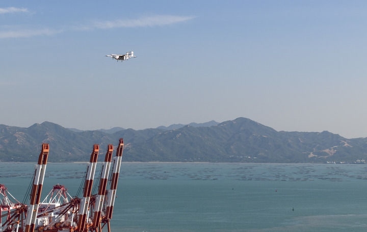 豐翼科技(深圳)有限公司的一架無(wú)人機(jī)搭載著快件從深圳蛇口集裝箱碼頭附近的起降點(diǎn)起飛,準(zhǔn)備飛往中山(2024年11月27日攝)。新華社記者 毛思倩 攝