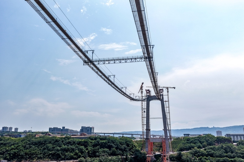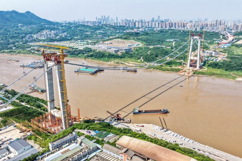 當(dāng)日,由重慶城投集團(tuán)投資、城投建設(shè)公司組織建設(shè)、中國鐵建大橋局承建的黃桷沱長江大橋順利完成主纜架設(shè)工作,標(biāo)志著大橋建設(shè)即將進(jìn)入鋼桁梁吊裝工序。黃桷沱長江大橋全長1260米,主跨765米,為單跨懸吊雙塔三跨連續(xù)鋼桁梁懸索橋,是國內(nèi)最大跨徑公軌兩用懸索橋。黃桷沱長江大橋是渝長高速復(fù)線連接道工程的控制性節(jié)點(diǎn)工程,建成后將成為聯(lián)系重慶主城區(qū)長江南北兩岸的重要交通干道。