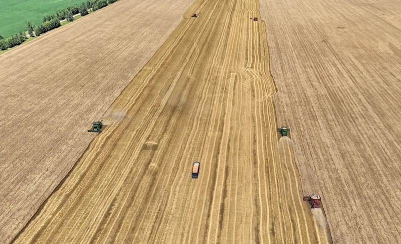 8月5日,在北大荒集團(tuán)黑龍江紅星農(nóng)場第二管理區(qū),大型收割機(jī)在搶收小麥(無人機(jī)照片)。