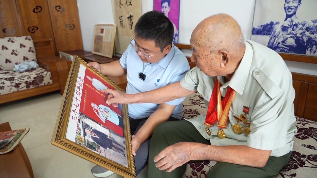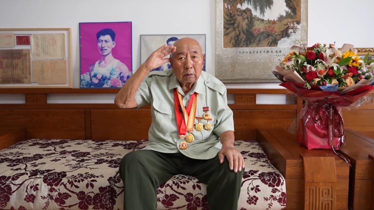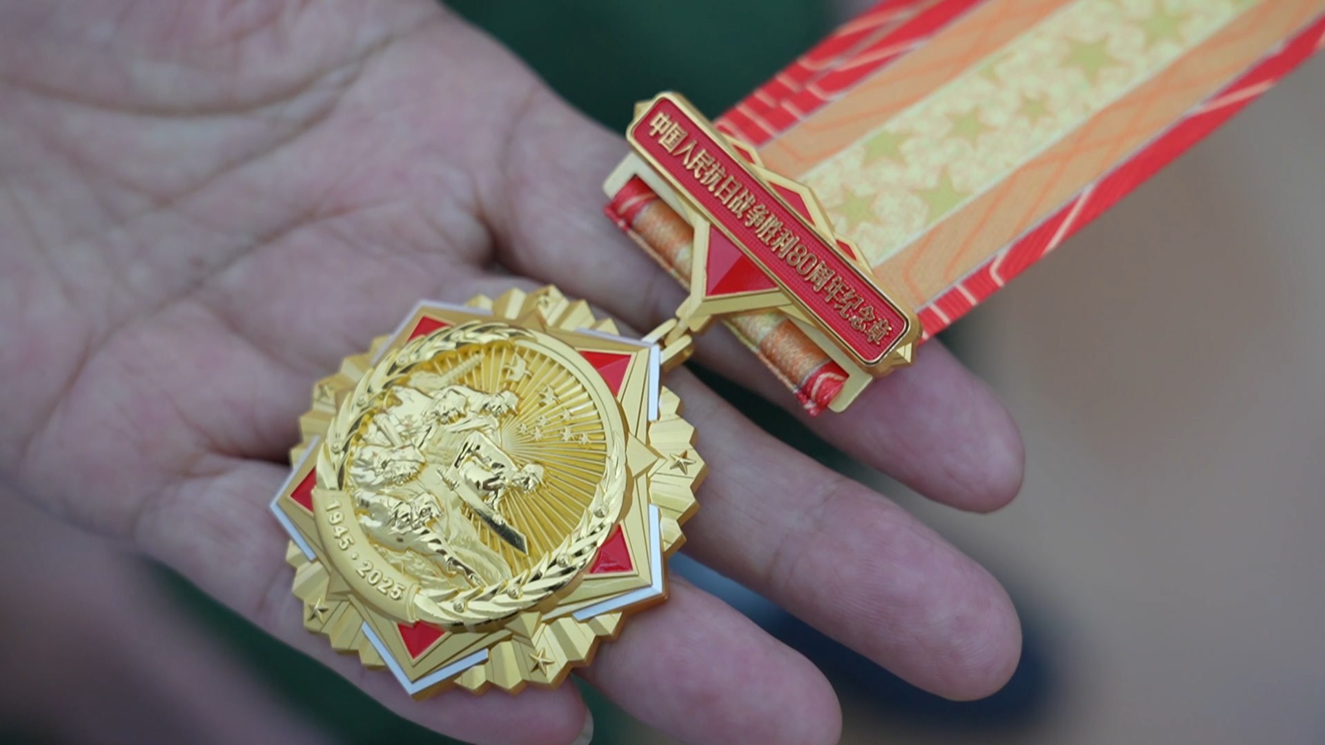 手捧“中國人民抗日戰(zhàn)爭勝利80周年”紀念章,