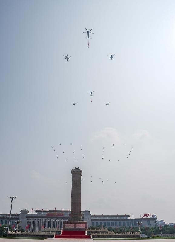 9月3日,紀(jì)念中國人民抗日戰(zhàn)爭暨世界反法西斯戰(zhàn)爭勝利80周年大會在北京隆重舉行。這是空中護(hù)旗梯隊飛過天安門廣場上空,26架直升機(jī)匯成巨大的“80”字樣。