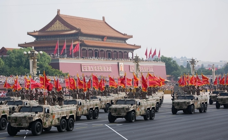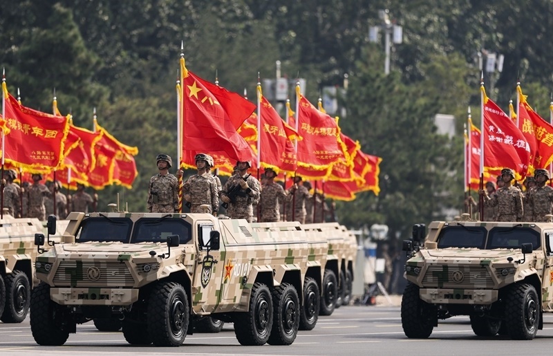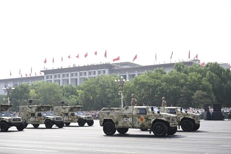 9月3日,紀(jì)念中國人民抗日戰(zhàn)爭暨世界反法西斯戰(zhàn)爭勝利80周年大會在北京隆重舉行。這是信息支援方隊(duì)接受檢閱。