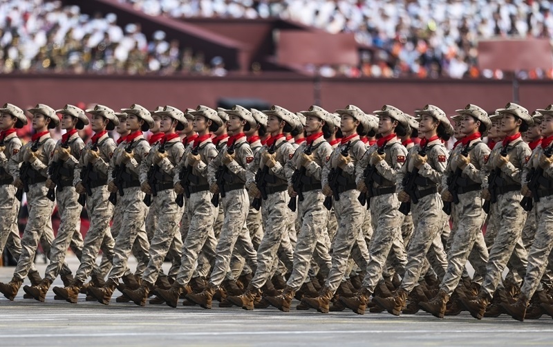 9月3日,紀(jì)念中國人民抗日戰(zhàn)爭暨世界反法西斯戰(zhàn)爭勝利80周年大會在北京隆重舉行。這是網(wǎng)絡(luò)空間部隊(duì)方隊(duì)接受檢閱。