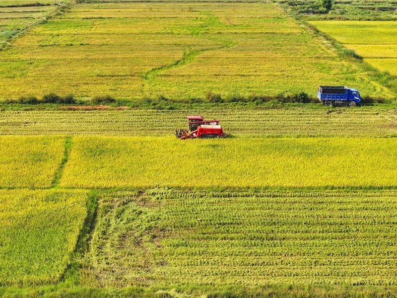 10月11日,湖南省衡陽(yáng)市衡山縣白果鎮(zhèn)村民駕駛農(nóng)機(jī)收割稻谷(無(wú)人機(jī)照片)。
