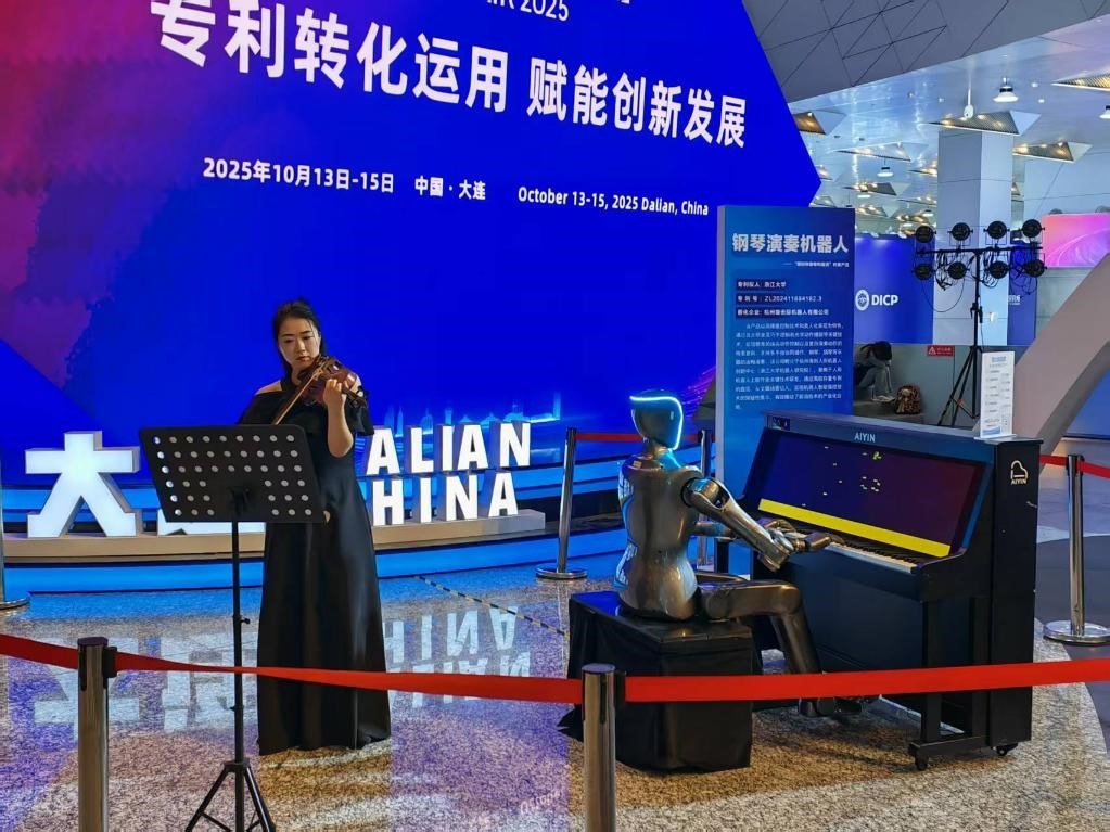 走進(jìn)一樓的展示大廳,一段優(yōu)美的音樂(lè)旋律緩緩流入耳中,一臺(tái)人形機(jī)器人指尖輕快地在鋼琴鍵盤上飛舞,和一名小提琴演奏家共同奏響《我和我的祖國(guó)》,引來(lái)許多與會(huì)嘉賓駐足聆聽(tīng)。