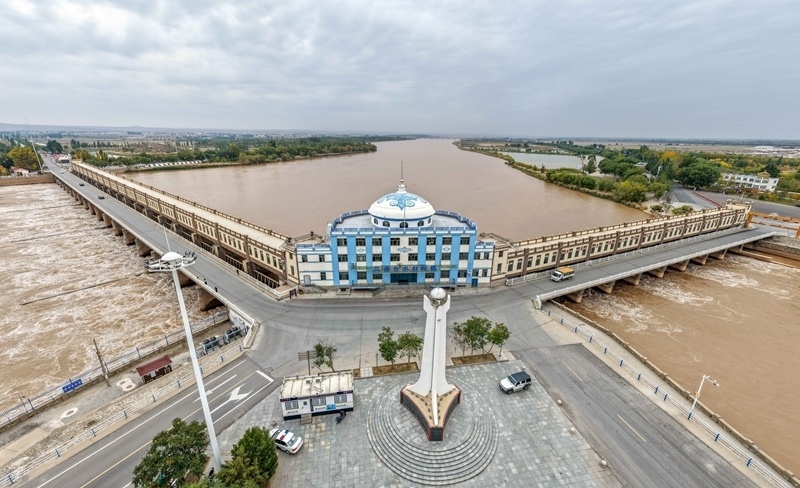 這是10月16日在內(nèi)蒙古巴彥淖爾市磴口縣拍攝的開閘放水的三盛公水利樞紐(無人機(jī)照片)。