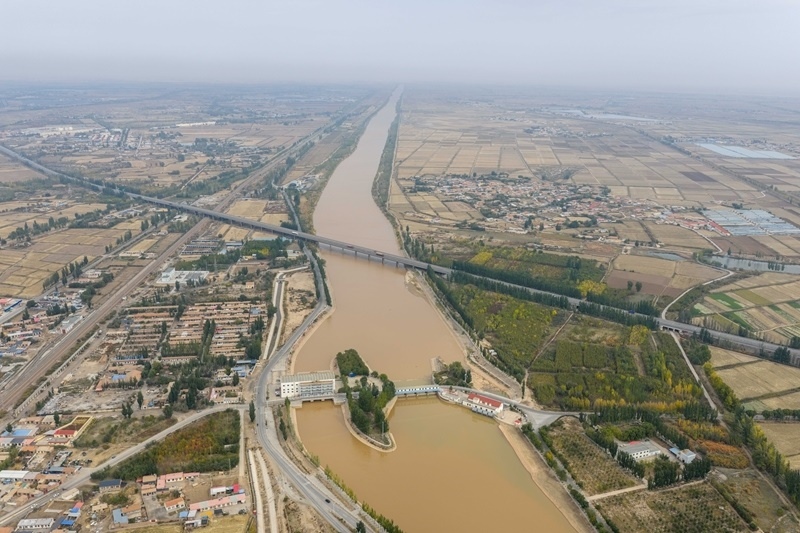 10月16日,用于灌溉的黃河水流經(jīng)內(nèi)蒙古巴彥淖爾市臨河區(qū)境內(nèi)的總干渠第二分水樞紐(無人機(jī)照片)。