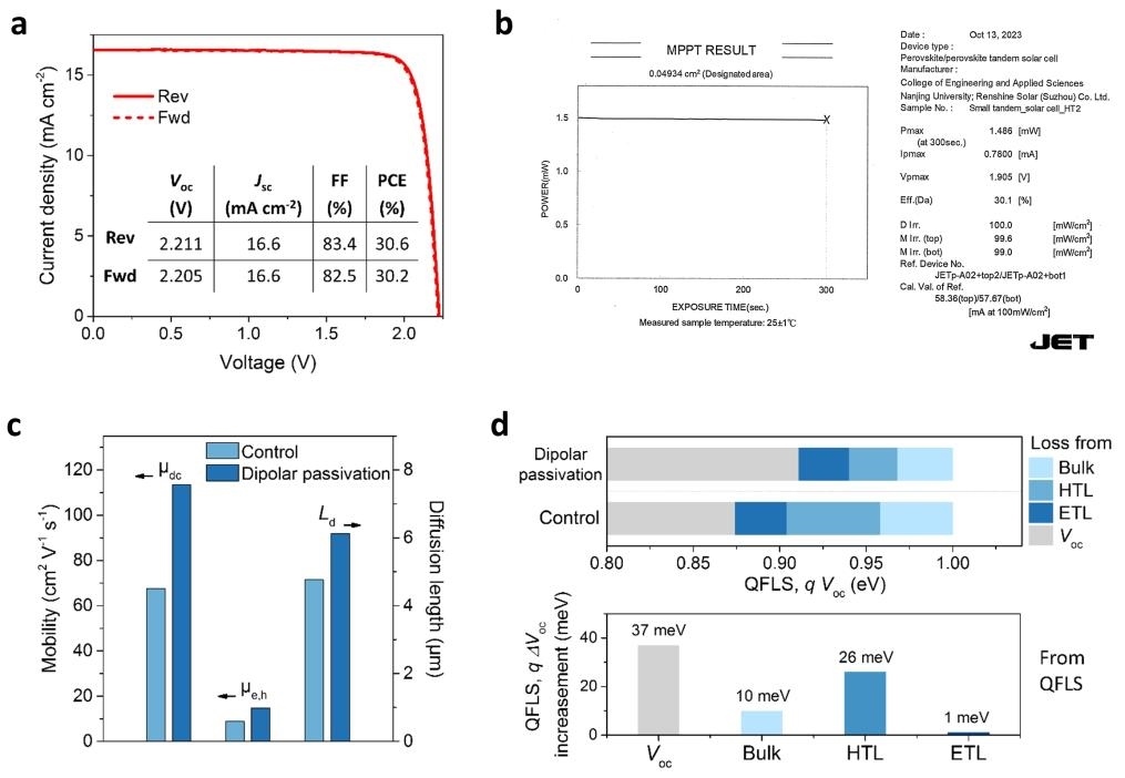 太赫茲輻射探測診斷結(jié)果清晰揭示了偶極鈍化策略在促進(jìn)電荷傳輸、抑制損耗等方面的微觀機制。實驗數(shù)據(jù)顯示,經(jīng)鈍化處理的鈣鈦礦薄膜,總載流子遷移率提升68%以上,載流子擴(kuò)散長度延長近30%。