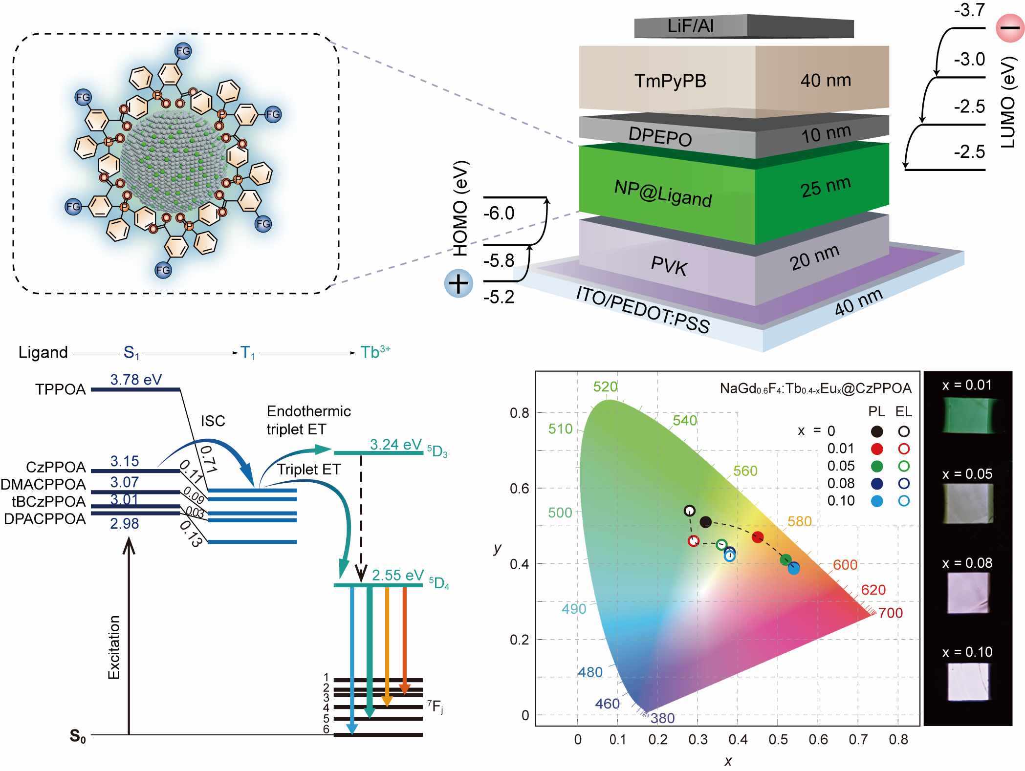 面對這一制約稀土材料邁向高端應(yīng)用的瓶頸,研究團(tuán)隊(duì)開創(chuàng)性地提出有機(jī)半導(dǎo)體敏化策略,以功能化有機(jī)配體作為“光電橋梁”,成功將能量精準(zhǔn)高效地傳遞給絕緣稀土納米晶,實(shí)現(xiàn)了電流驅(qū)動下的高效發(fā)光。