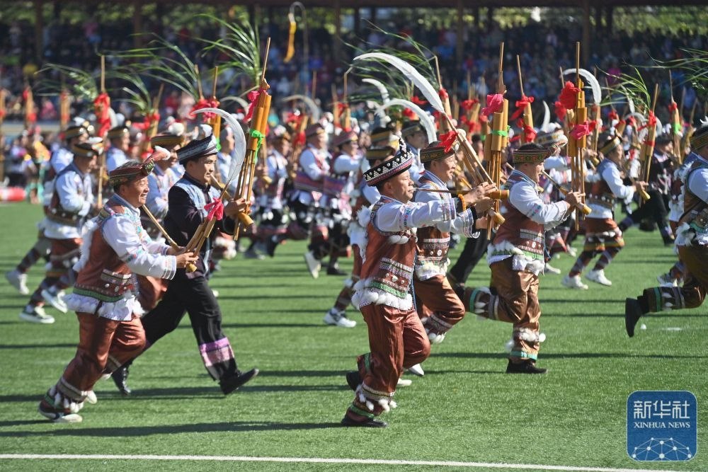 ↑11月29日,表演者在融水縣民族體育公園舉行的蘆笙斗馬節(jié)開幕式現(xiàn)場(chǎng)表演。新華社記者 黃孝邦 攝