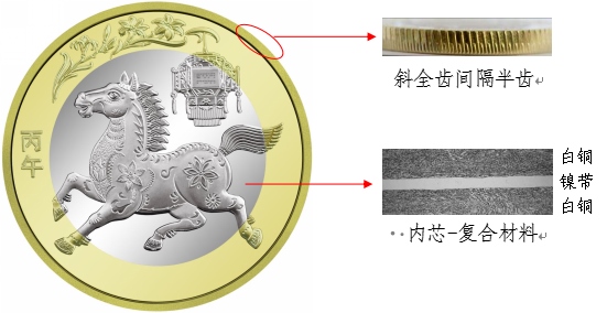 硬幣外環(huán)為黃銅合金,內(nèi)芯為具有獨特機(jī)讀性能的鎳帶復(fù)合白銅材料。防偽特征效果見圖1。