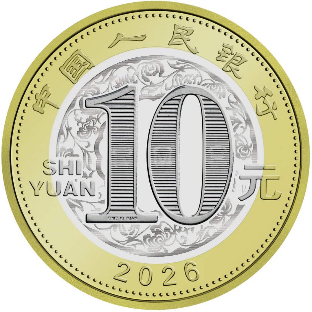 雙色銅合金紀(jì)念幣正面圖案為“中國人民銀行”、“10元”字樣,漢語拼音字母“SHIYUAN”及年號“2026”,底紋襯以團(tuán)花圖案。