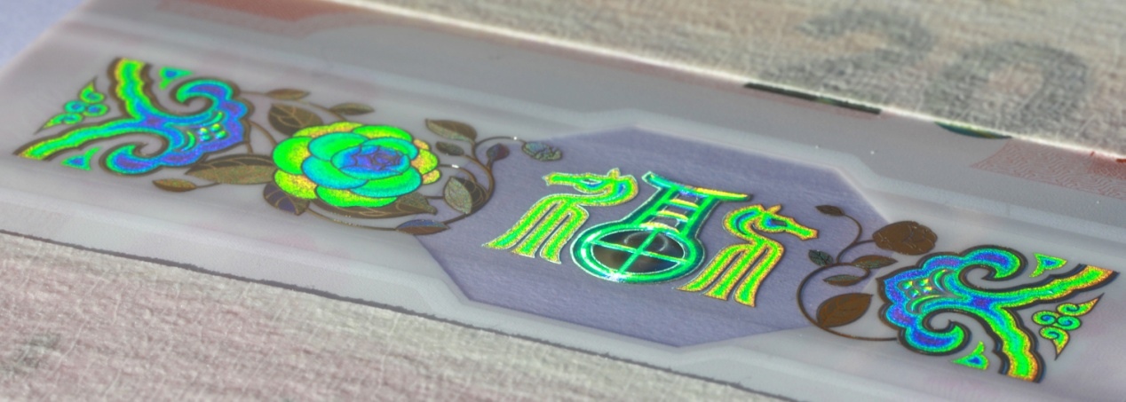 位于票面下方。改變觀察角度,票面正面可見“如意云紋”、“山茶花”與“?!弊纸M成的裝飾紋樣呈現(xiàn)多色動感特征?!案!弊窒虏俊疤铩弊謨?nèi)可見立體動感高亮圓環(huán)效果。防偽特征效果見圖6。