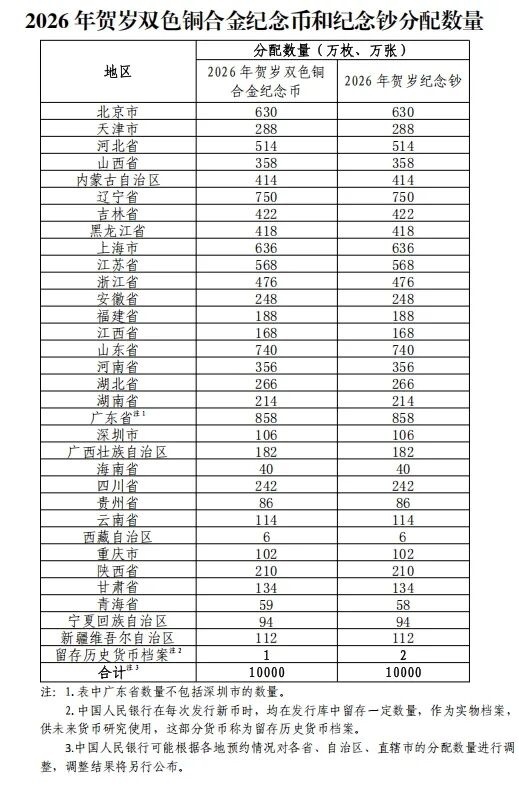 2026年1月12日前,中國人民銀行分支機(jī)構(gòu)將向社會公告當(dāng)?shù)?026年賀歲雙色銅合金紀(jì)念幣和紀(jì)念鈔的分配數(shù)量等信息。承辦銀行將在其官方網(wǎng)站公布2026年賀歲雙色銅合金紀(jì)念幣和紀(jì)念鈔預(yù)約兌換網(wǎng)點及每個網(wǎng)點的可預(yù)約數(shù)量等信息。