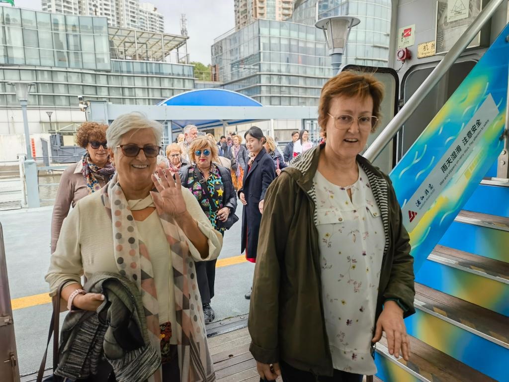 11月5日,來自西班牙等國的游客登上黃浦江游船。新華社記者 陳愛平 攝
