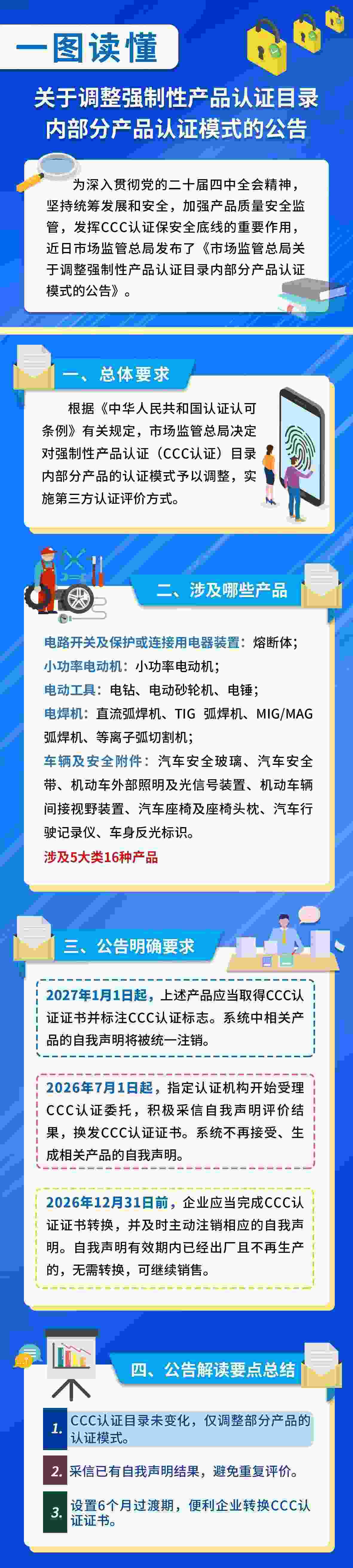《公告》要求,2027年1月1日起,相關(guān)產(chǎn)品應(yīng)當(dāng)取得CCC認(rèn)證證書并加貼CCC標(biāo)志,方可出廠、銷售、進(jìn)口或者在其他經(jīng)營活動中使用。2026年7月1日起,指定認(rèn)證機(jī)構(gòu)開始受理相關(guān)產(chǎn)品的CCC認(rèn)證委托。