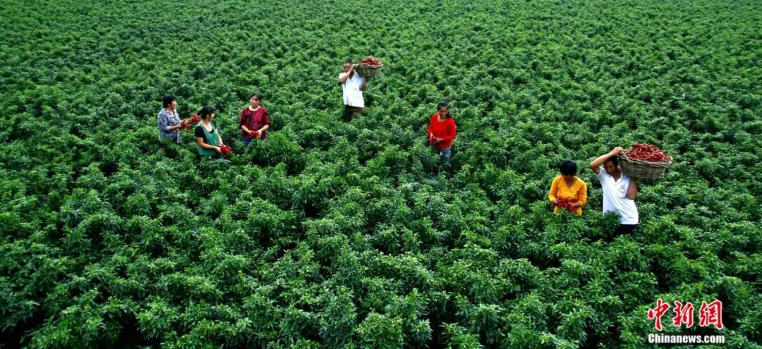 冀南平原上,連片的辣椒田如紅色海洋翻涌——細長的羊角椒緊緊扒著枝頭蕩來蕩去,油亮的皮膚曬得通紅。