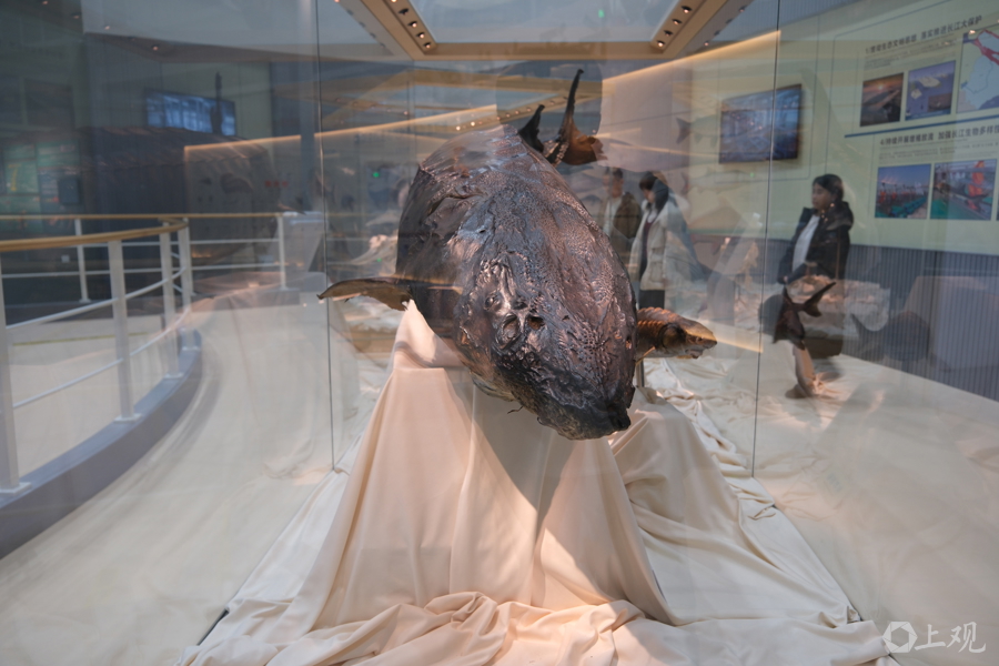 水野中心內(nèi)科普館的“鎮(zhèn)館之寶”,是一尾中華鱘標(biāo)本。它長3.5米,重350公斤。2007年7月17日在金山區(qū)杭州灣水域誤入漁網(wǎng)受傷,經(jīng)全力救治成功存活1232天,在2010年12月1日死亡,創(chuàng)下當(dāng)時(shí)國內(nèi)搶救救治中華鱘最長存活紀(jì)錄 郜陽 攝