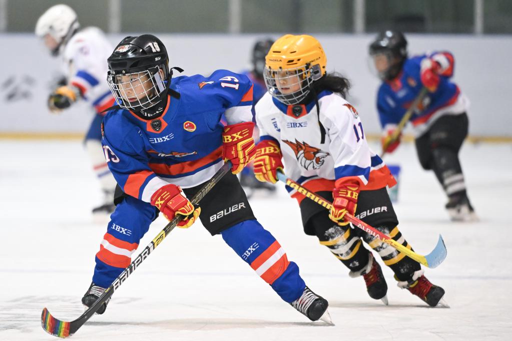 1月25日,在齊齊哈爾市的黑龍體育館內(nèi),二馬路小學(xué)翼虎冰球隊隊員劉金梓晨(左)在訓(xùn)練中。新華社記者 張濤 攝