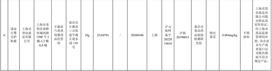 產(chǎn)品標簽標示為上海貞賢化妝品有限公司生產(chǎn)的諾必行嬰寶護膚霜檢出不得添加的特比萘芬。(備注:上海貞賢化妝品有限公司提出樣品真實性異議。經(jīng)上海市藥品監(jiān)督管理局審查,該企業(yè)未生產(chǎn)或者進口過該批次抽檢不符合規(guī)定產(chǎn)品。)