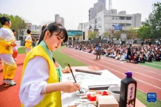 4月10日,在天津小學,學生們在操場上觀看傳統(tǒng)文化表演。