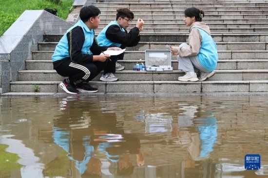 4月29日,在衡陽縣西渡鎮(zhèn)新橋村,南華大學的大學生志愿者在檢測水質。