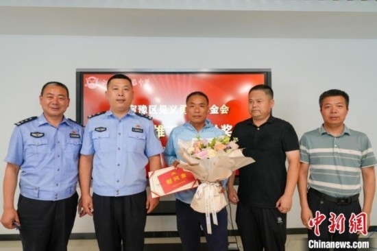 宿遷市公安局宿豫分局和宿豫區(qū)見義勇為基金會(huì)為丁成闖送上見義勇為表彰證書和慰問(wèn)金。宿豫區(qū)委宣傳部供圖