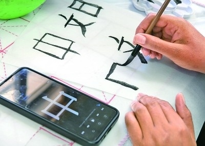 英國(guó)倫敦,一名學(xué)生在2023年“國(guó)際中文日”英國(guó)主題活動(dòng)上展示自己的書(shū)法。新華社發(fā)