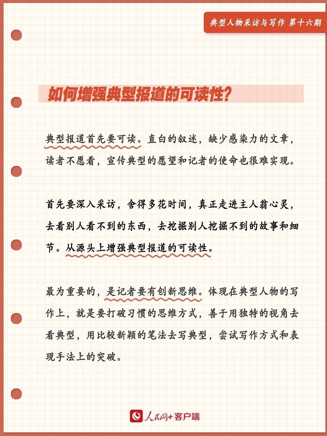 提要:創(chuàng)新思維最為重要。典型人物寫作要打破習(xí)慣思維方式,善于用獨(dú)特的視角去看典型,用比較新穎的筆法去寫典型,嘗試寫作方式和表現(xiàn)手法上的突破。有新意,便可讀??勺x性強(qiáng),才容易引起共鳴。