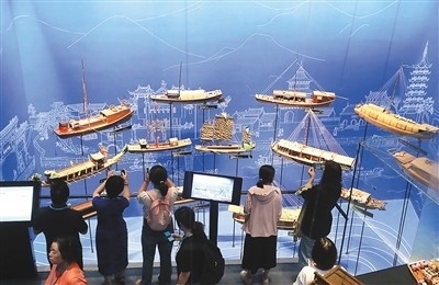 隨著暑假臨近,江蘇省揚州市暑期游逐漸升溫,眾多游客來到揚州中國大運河博物館參觀游覽,感受運河文化的魅力。圖為游客在揚州中國大運河博物館參觀。孟德龍攝(人民圖片)