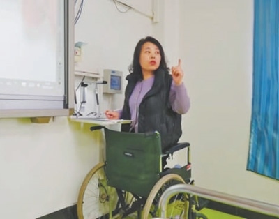因?yàn)闊o(wú)法行走,王秀穎上課只能依靠輪椅。為了不影響教學(xué),她把輪椅滑到幻燈機(jī)前,跪在輪椅上,找到合適的高度,一邊講解,一邊演算、書(shū)寫(xiě)。