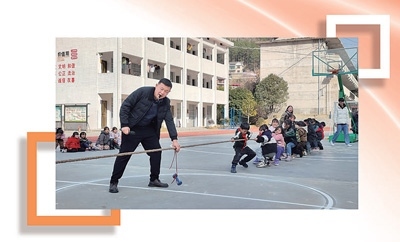 湖南省安化縣南金鄉(xiāng)將軍完小的操場(chǎng)上,龐曉曉(前排左一)組織學(xué)生們開(kāi)展拔河比賽。