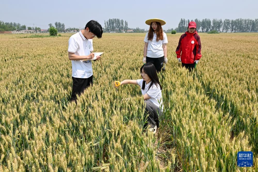 5月26日,河北省曲周縣傅莊科技小院的學(xué)生在麥田里測(cè)量植株高度。