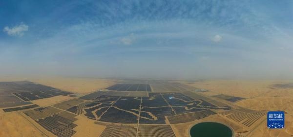 一匹占地130多萬平方米的沙漠“駿馬”橫臥在內(nèi)蒙古自治區(qū)庫布其沙漠之中,這是位于達(dá)拉特光伏發(fā)電應(yīng)用領(lǐng)跑基地中、由近20萬塊光伏板組成的“駿馬電站”。該電站采用“林光互補(bǔ)”模式,板上發(fā)電、板下種植,在開發(fā)利用庫布其沙漠豐富太陽能資源的同時(shí),推動沙漠生態(tài)治理。