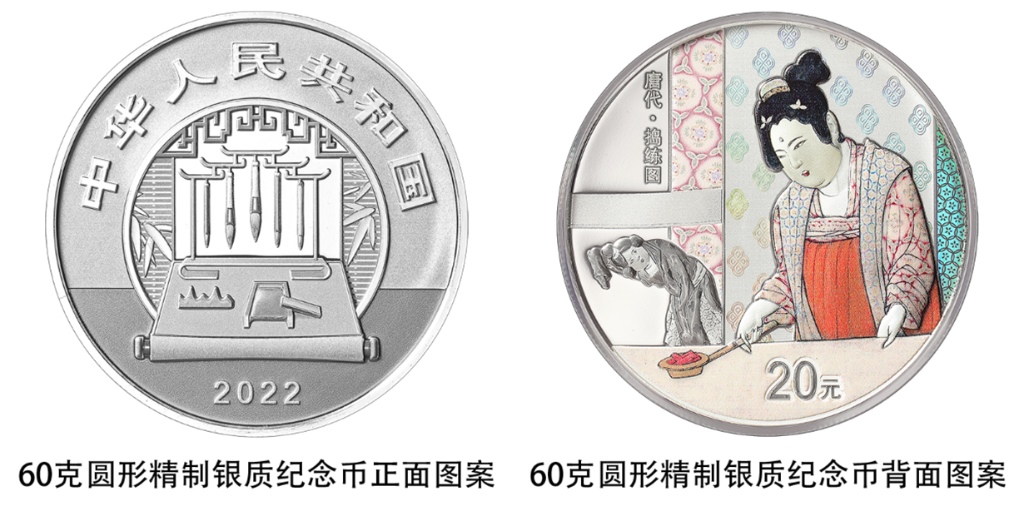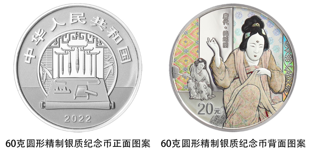 一枚60克圓形銀質(zhì)紀(jì)念幣背面圖案為《搗練圖》中扯練造型,襯以裝飾紋樣組合設(shè)計,并刊“唐代·搗練圖”字樣及面額。