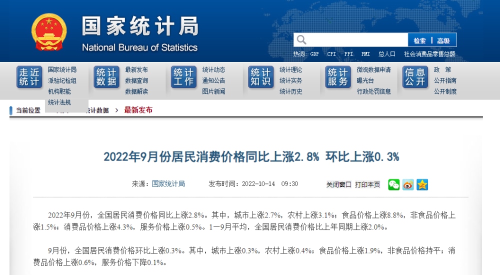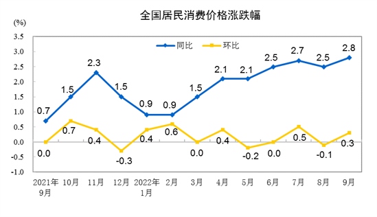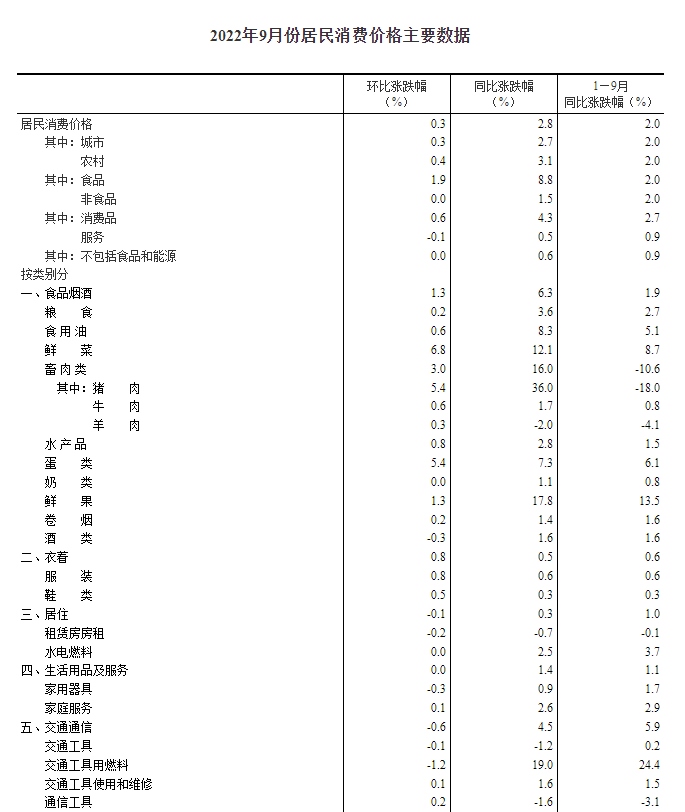 2022年9月份,全國(guó)居民消費(fèi)價(jià)格同比上漲2.8%。其中,城市上漲2.7%,農(nóng)村上漲3.1%;食品價(jià)格上漲8.8%,非食品價(jià)格上漲1.5%;消費(fèi)品價(jià)格上漲4.3%,服務(wù)價(jià)格上漲0.5%。1--—9月平均,全國(guó)居民消費(fèi)價(jià)格比上年同期上漲2.0%。