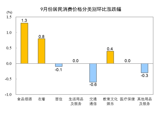 9月份,全國(guó)居民消費(fèi)價(jià)格環(huán)比上漲0.3%。其中,城市上漲0.3%,農(nóng)村上漲0.4%;食品價(jià)格上漲1.9%,非食品價(jià)格持平;消費(fèi)品價(jià)格上漲0.6%,服務(wù)價(jià)格下降0.1%。