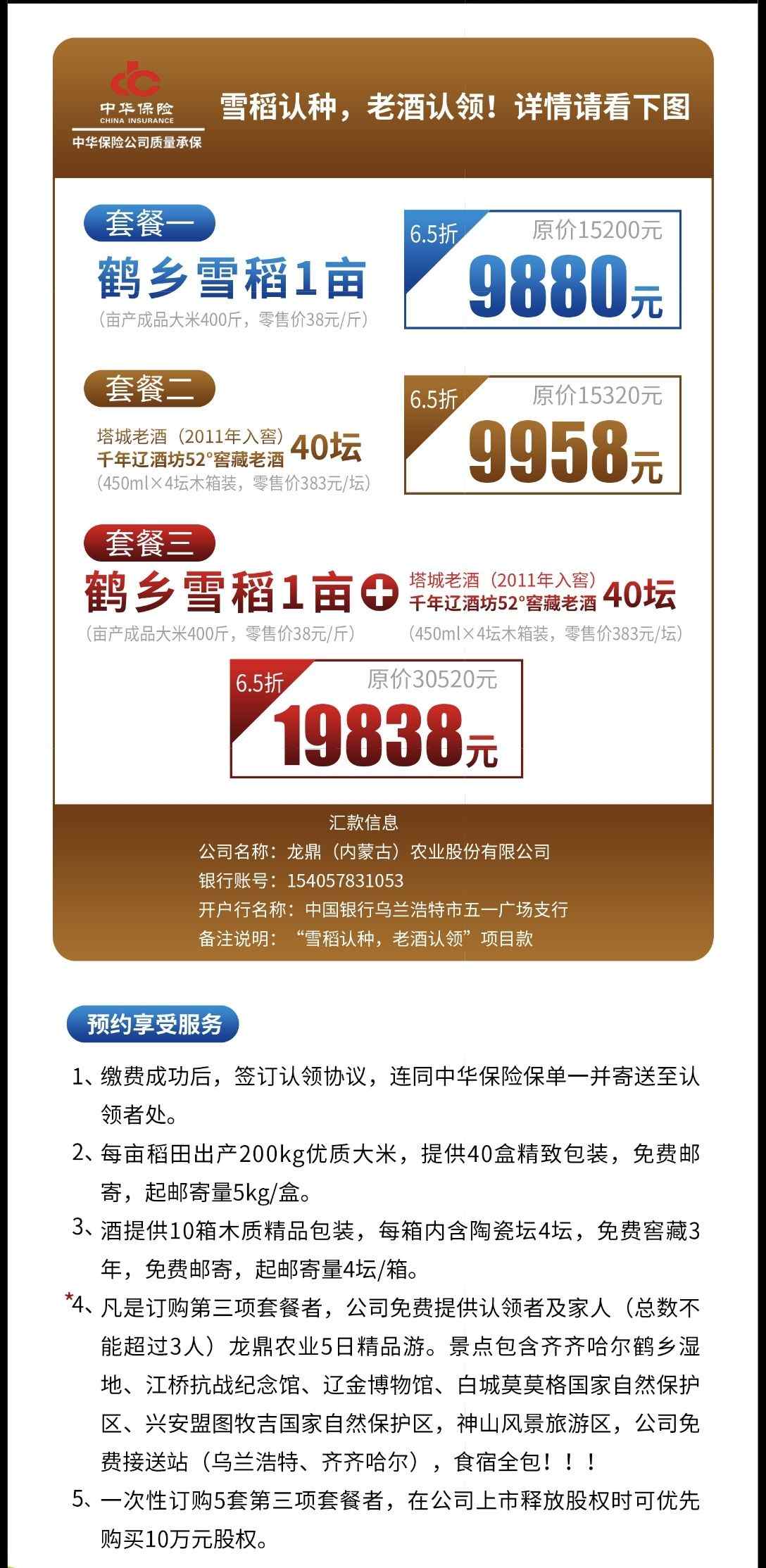 目前,“雪稻認種、老酒認領(lǐng)”共有三種認領(lǐng)套餐(如圖),認領(lǐng)第三種套餐,全家可享有龍鼎農(nóng)業(yè)5日深度精品游,景點包含齊齊哈爾鶴鄉(xiāng)濕地、江橋抗戰(zhàn)紀念館、遼金博物館、白城莫莫格國家自然保護區(qū)、興安盟圖牧吉國家自然保護區(qū)、神山風景旅游區(qū),公司免費接送站(烏蘭浩特、齊齊哈爾) ,食宿全包。