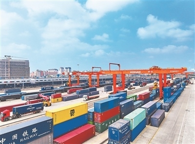 說話的空當(dāng),咚咚咚……十幾輛運(yùn)輸車?yán)d著集裝箱,有序開進(jìn)場站。汽車的轟鳴聲,吊車的運(yùn)行聲,作業(yè)人員大聲溝通的聲音,一首陸港“交響曲”奏響著。