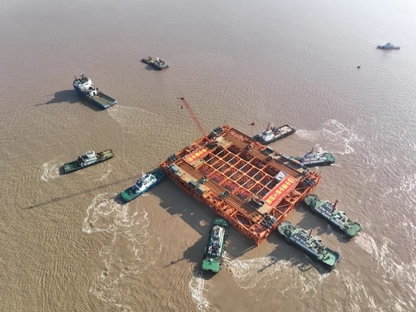 施工單位結合5號墩基礎施工條件,采用自浮式鉆孔平臺方案,自浮式鉆孔平臺由“鋼樁+鋼架”作為主要承重結構,在底部設置浮箱結構,使其具備自浮功能;平臺長130米、寬100米,重達7600噸,平面面積達13000平方米,相當于31個標準籃球場大小。