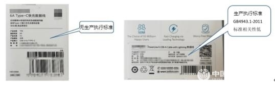 5.46款樣品有36款明示了生產(chǎn)執(zhí)行標(biāo)準(zhǔn),10款未明示生產(chǎn)執(zhí)行標(biāo)準(zhǔn)。明示的標(biāo)準(zhǔn)絕大多數(shù)為企業(yè)標(biāo)準(zhǔn),少數(shù)為已過時效期的行業(yè)標(biāo)準(zhǔn),或與數(shù)據(jù)線產(chǎn)品無相關(guān)性的安全標(biāo)準(zhǔn)。
