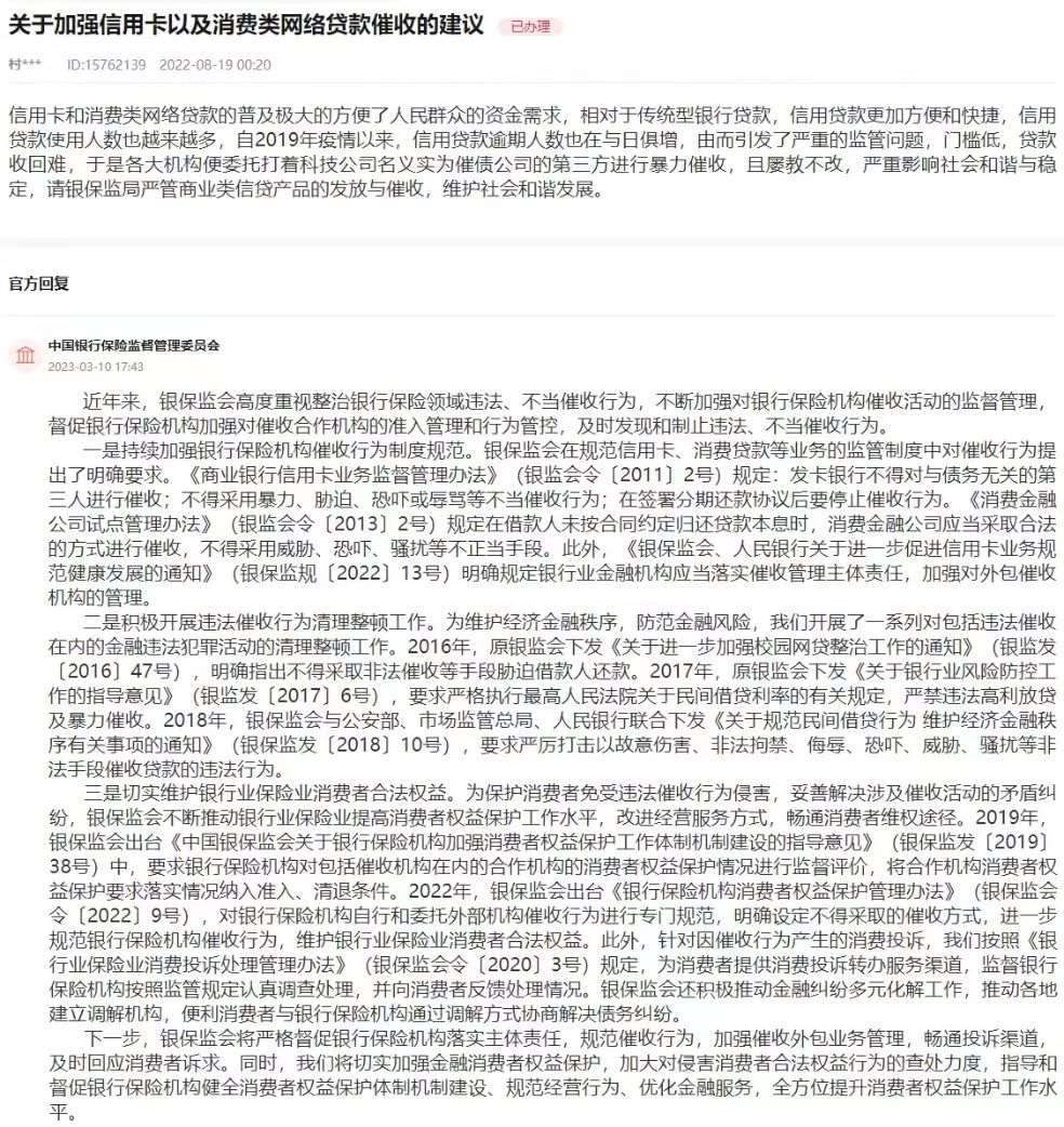 銀保監(jiān)會(huì)在回復(fù)中表示,近年來,銀保監(jiān)會(huì)高度重視整治銀行保險(xiǎn)領(lǐng)域違法、不當(dāng)催收行為,不斷加強(qiáng)對(duì)銀行保險(xiǎn)機(jī)構(gòu)催收活動(dòng)的監(jiān)督管理,督促銀行保險(xiǎn)機(jī)構(gòu)加強(qiáng)對(duì)催收合作機(jī)構(gòu)的準(zhǔn)入管理和行為管控,及時(shí)發(fā)現(xiàn)和制止違法、不當(dāng)催收行為。
