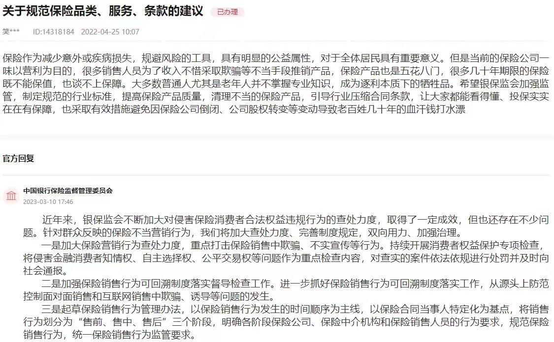 “近年來,銀保監(jiān)會(huì)不斷加大對(duì)侵害保險(xiǎn)消費(fèi)者合法權(quán)益違規(guī)行為的查處力度,取得了一定成效,但也還存在不少問題?!便y保監(jiān)會(huì)在回復(fù)中表示,針對(duì)群眾反映的保險(xiǎn)不當(dāng)營(yíng)銷行為,將加大查處力度、完善制度規(guī)定,雙向用力、加強(qiáng)治理。